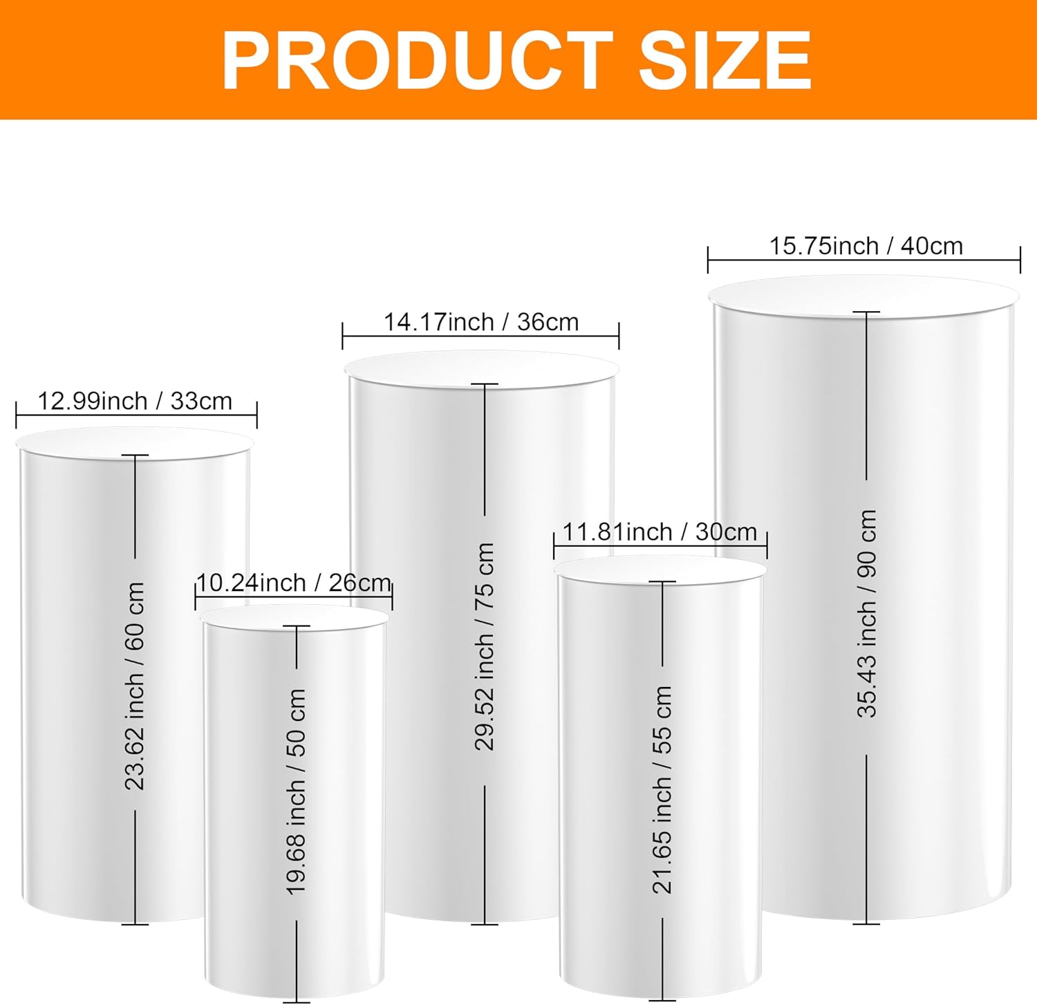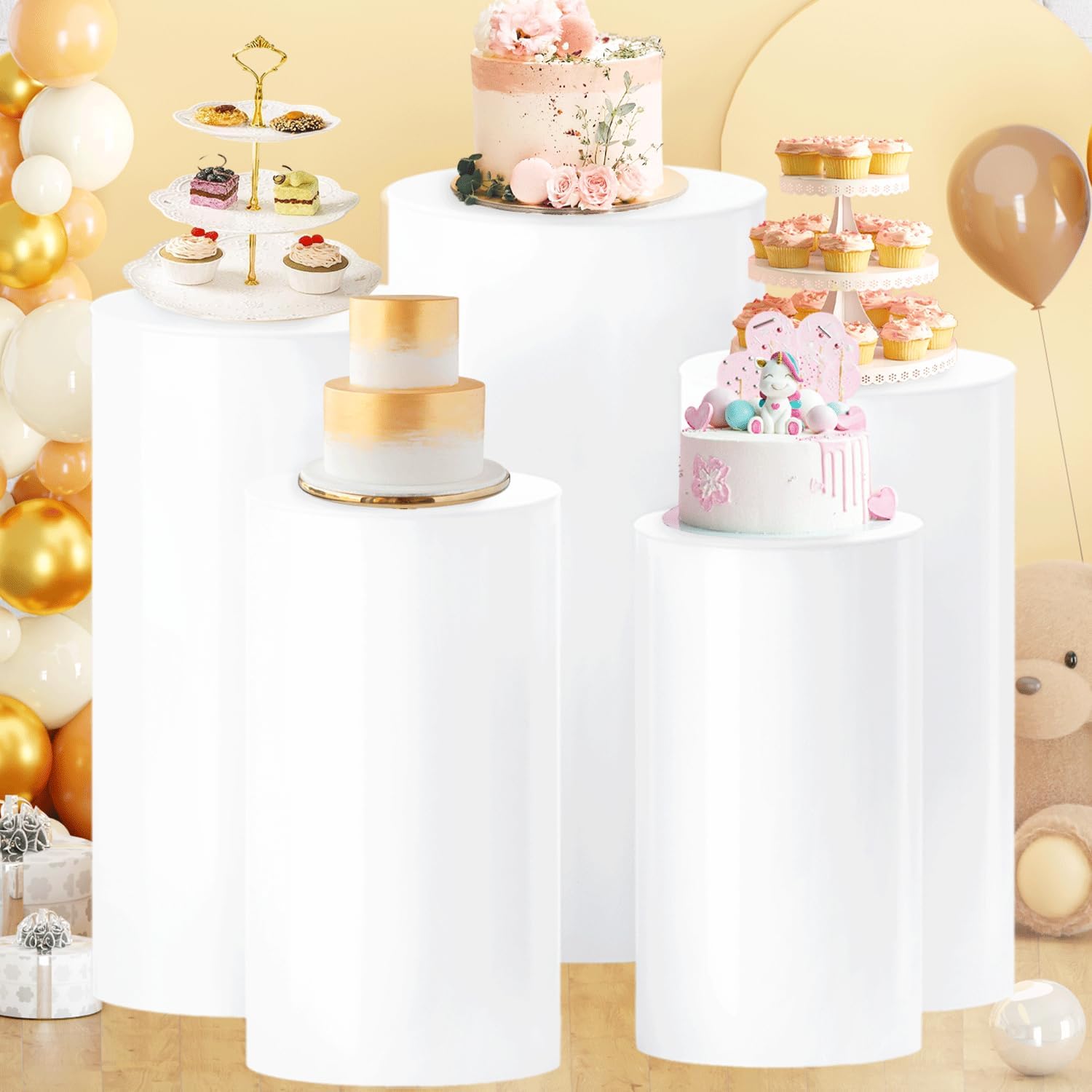 Add height, elegance, and style to your event setup with this 5-piece set of cylinder pedestal stands. Perfect for showcasing cakes, floral arrangements, desserts, or decorative accents. These versatile stands come in graduated sizes, making them ideal for creating eye-catching displays at weddings, birthdays, baby showers, and more. Sleek and modern, they complement various themes and color palettes.
