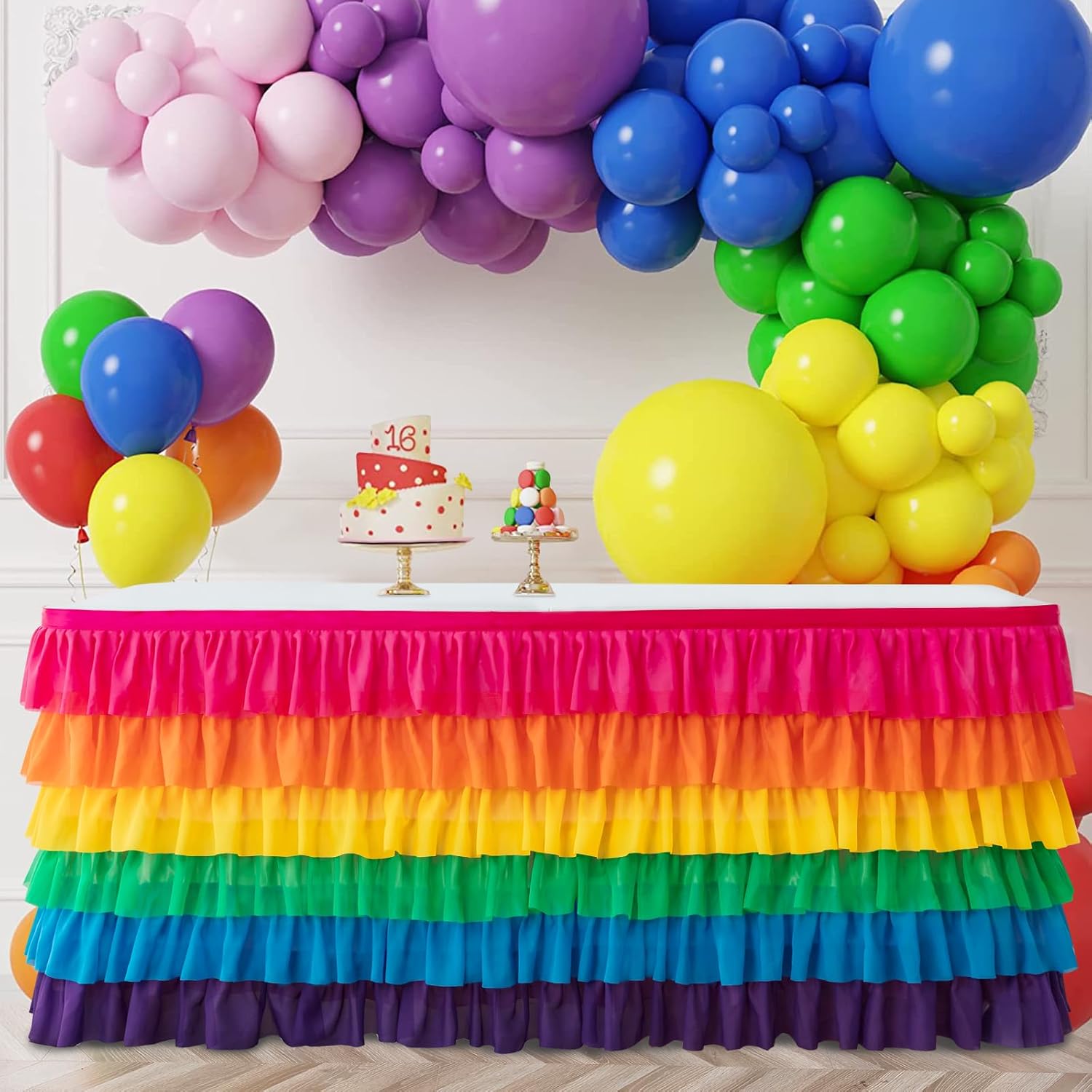 A playful and colorful 14-foot ruffled table skirt—perfect for birthday parties, baby showers, and festive displays.